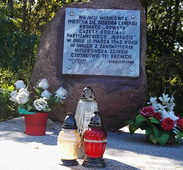 Treść inskrypcji: WE WSI WIŚNIÓWKA / MIEŚCIŁA SIĘ SIEDZIBA CENTRALI / REDAKCJI „ODWETU”/ GAZETY ODDZIAŁU / PARTYZANCKIEGO „JĘDRUSIE” / W DNIU 17 MARCA 1942 ROKU / W WALCE Z ŻANDARMERIĄ / HITLEROWSKĄ ZGINĘLI / CZŁONKOWIE TEJ REDAKCJI / WIŚNIÓWKA / 4.IX.1971 / SPOŁECZEŃSTWO
