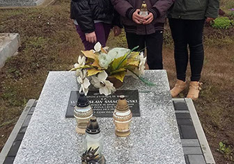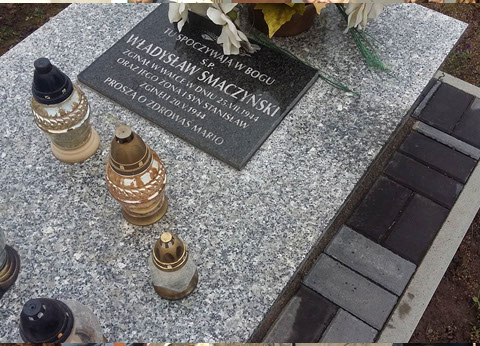 TU SPOCZYWAJĄ W BOGU/ Ś.P./ WŁADYSŁAW SMACZYŃSKI/ ZGINĄŁ W WALCE W DNIU 25.VII.1944/ ORAZ JEGO ŻONA I SYN STANISŁAW/ ZGINĘLI 20.V.1944/ PROSZĄ O ZDROWAŚ MARIO/