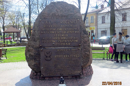 W DNIU 3.IX.1944 r./ ODDZIAŁY PARTYZANCKIE ZGRUPOWANE/ W II BATALIONIE, 2 PUŁKU, 2 DYWIZJI/ ARMII KRAJOWEJ/ W SKŁADZIE:/ 4 KOMPANIA d-ca ppor. „BURZA” R. NIEWÓJT/ 4 KOMPANIA d-ca „ZAWISZA” K. OLCHOWIK/ 6 KOMPANIA d-ca por. „RÓG” R. RÓŻYŃSKI/ STOCZYŁY ZWYCIĘSKĄ BITWĘ Z WOJSKAMI/ HITLEROWSKIMI W OBRONIE RADOSZYC/ OCALAJAC LUDNOŚĆ OD ZAGŁADY/ W 40 ROCZNICĘ BITWY TABLICĘ UFUNDOWALI BYLI ŻOŁNIERZE/ 2 BAT. kpt. „TARNINY” T. PYTLAKOWSKIEGO/ 3.IX.1984/ BEZ ODZNAK MUNDURÓW/ BEZ ORŁÓW I GWIAZD/ I ŻYCIE SWE MAJĄC/ W OFIERZE/ TOCZYLIŚMY WALKĘ/ ZA WOLNOŚĆ I LUD/ MY ARMII KRAJOWEJ/ ŻOŁNIERZE/ () E. ODORKIEWICZ/ 3.IX.1944/