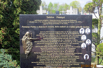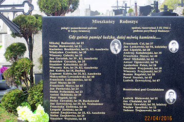 TABLICE PAMIĘCI/ POŚWIĘCONE POLEGŁYM I ZAMORDOWANYM MIESZKAŃCOM RADOSZYC,/ UFUNDOWANE W 70. ROCZNICĘ NAPAŚCI HITLEROWSKICH NIEMIEC NA POLSKĘ 1 IX 1939 R./ I AGRESJI ROSJI SOWIECKIEJ 17 IX 1939 R./ PAMIĘTAJ POLSKO O DZIECIACH SWYCH/ KTÓRE MIŁOŚĆ DO CIEBIE OPŁACIŁY ŻYCIEM/ PPOR.REZ.WP TADEUSZ AUGUSTYNIAK, LAT 35, ZG. W KATYNIU/ PPOR.REZ.WP WINCENTY LIŚKIEWICZ. LAT 34, ZG. W CHARKOWIE/ POR.REZ.WP JÓZEF LIŚKIEWICZ, NAUCZYCIEL, ZG. W KL AUSCHWITZ/ KPT.WP JAN STOIŃSKI, PS. BRZOZA, GÓRSKI, LAT 35, NAUCZYCIEL, HUBALCZYK,/ KMDT KONECKIEGO OBWODU ZWZ/AK/ KAWALER KRZYŻA WALECZNYCH, ZG. W KOŃSKICH W 1942 R./ POR.REZ.WP KAZIMIERZ RUTKOWSKI, LAT 29, NAUCZYCIEL, ZG. W KL AUSCHWITZ/ POR.REZ.WP EDWARD TURNO, LAT 41, NAUCZYCIEL, ZG. W KL AUSCHWITZ/ POS. PP JAN CUPIAŁ, LAT 49, ZG. W MIEDNOJE/ PPOR.REZ.WP STEFAN FRANKIEWICZ, LAT 36, NAUCZYCIEL, ZG. W KL AUSCHWITZ/ KPT.REZ.WP ANTONI WOJNOWSKI, LAT 45, ZG. W KUROPATACH/ PLUT.REZ.WP SEWERYN CHOIŃSKI, LAT 41, ZG. W MIEDNOJE/ POS. PP WŁADYSŁAW DZWONEK, LAT 40, ZG. W MIEDNOJE/ MARIAN KACZOROWSKI, LAT 23, PS. GRUSZKA, HUBALCZYK, ZAMORDOWANY PRZEZ GESTAPO/ SZCZEPAN BOGULAK, ZG. W KAMPANII WRZEŚNIOWEJ 1939 R./ RYSZARD BRZOZOWSKI, LAT 22, ŻOŁNIERZ II KORPUSU WP ZG. W EGIPCIE/ POR.REZ.WP, LAT 39, ZAMORDOWANY PRZEZ GESTAPO/ STANISŁAW WOJNOWSKI, LAT 25, ZAMORDOWANY PRZEZ GESTAPO/ MARIAN NOWIŃSKI PS. URBAN, LAT 22, ŻOŁNIERZ AK, ZG. W 1945 R./ POR.REZ.WP BRONISŁAW SZUSTAK, LAT 35, NAUCZYCIEL, ZG. W KAMPANII WRZEŚNIOWEJ 1939 R./ PPOR.REZ.WP EDWARD PODWYSOCKI, LAT 31, NAUCZYCIEL, ZG. W KATYNIU/ TADEUSZ CZARNECKI, LAT 22, ŻOŁNIERZ WP/ PPOR.WP STEFAN ZIELIŃSKI, NAUCZYCIEL, OCHOTNIK WOJNY 1920 R., POLEGŁ NA WOŁYNIU/ POS. PP WINCENTY ZIMIŃSKI, LAT 49, ZG. W MIEDNOJE/