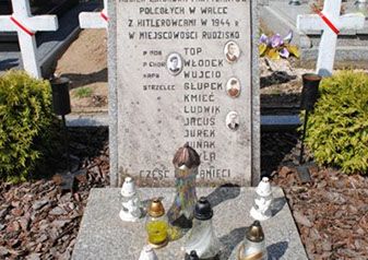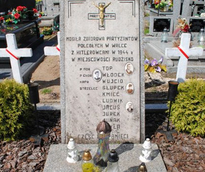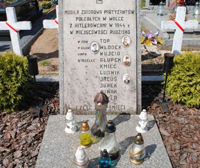 MOGIŁA ZBIOROWA PARTYZANTÓW/ POLEGLYCH W WALCE/ Z HITLEROWCAMI W 1944 R./ W MIEJSCOWOŚCI RUDZISKO/ P.POR. TOP/ P.CHOR. WŁODEK/ KAPR. WUJCIO/ STRZELEC GŁUPEK/ ” KMIEĆ/ ” LUDWIK/ ” JACUŚ/ ” JUREK/ ” JUNAK/ ” BRYŁA/ CZEŚĆ ICH PAMIĘCI/