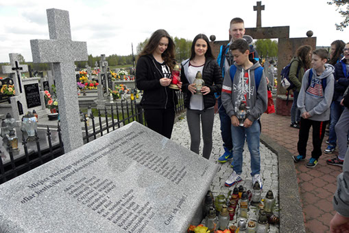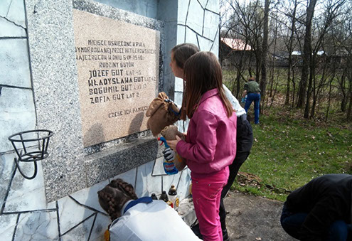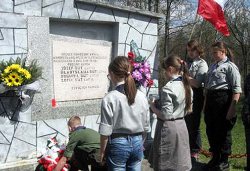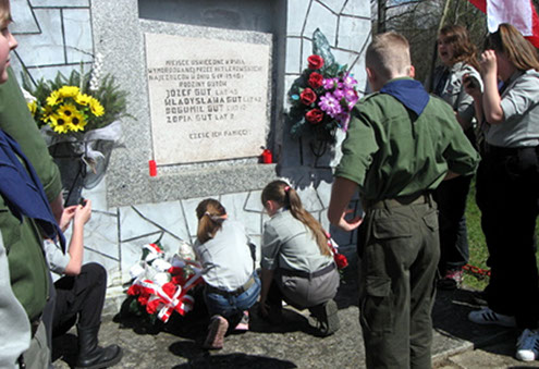 MIEJSCE UŚWIĘCONE KRWIĄ/ WYMORDOWANEJ PRZEZ HITLEROWSKICH/ NAJEŹDŹCÓW W DNIU 5 IV 1940 r./ RODZINY GUTÓW/ JÓZEF GUT LAT 45/ WŁADYSŁAWA GUT LAT 42/ BOGUMIŁ GUT LAT 12/ ZOFIA GUT LAT 2/ CZEŚĆ ICH PAMIĘCI!/