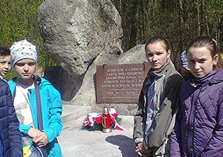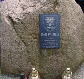 DĄB PAMIĘCI/ POSADZONY DLA UHONOROWANIA/ ASPIRANTA/ STEFANA MÜLLERA/ UR. 03.08.1908 W ŁODZI/ ZAMORDOWANEGO STRZAŁEM W TYŁ GŁOWY/ PRZEZ NKWD W TWERZE W ROKU 1940/ PROGRAM „KATYŃ… OCALIĆ OD ZAPOMNIENIA”