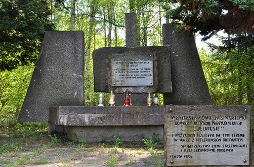 WŁADYSŁAWOWI JASIŃSKIEMU/ DOWÓDCY ODDZIAŁU PARTYZANCKIEGO/ „JĘDRUSIE”/ I WSZYSTKIM POLEGŁYM NA TYM TERENIE/ W WALCE Z HITLEROWSKIM OKUPANTEM/ SPOŁECZEŃSTWO ZIEMI STASZOWSKIEJ/ I BYLI CZŁONKOWIE ODDZIAŁU/ STYCZEŃ 1973 r./