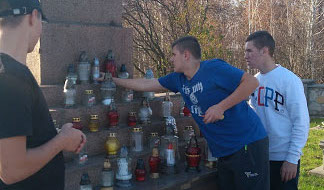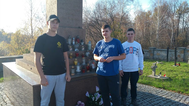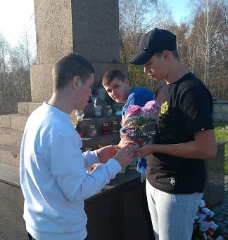 [treść inskrypcji na marmurowej tablicy widniejącej po lewej stronie, nieopodal pomnika]