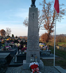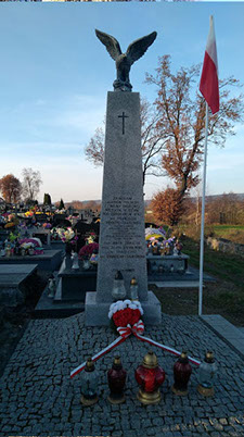Opis: Ppłk. Antoni Jabłoński (1896-1920) bohater walk o wolność Polski. W okresie studiów należał do Związku Strzeleckiego. W sierpniu 1914 r. był jednym z ułanów patrolu konnego Władysława Beliny–Prażmowskiego, poprzedzającego wymarsz I Kompani Kadrowej. Żołnierz I Brygady Legionów Polskich. W wojnie polsko–bolszewickiej był dowódcą 11 Pułku Ułanów. Raniony podczas szarży pod Nową Sieniawką w kręgosłup, zmarł w szpitalu we Lwowie. Pochowany w rodzinnym grobowcu, który został odrestaurowany w ostatnich latach. Monument wykonany z ciemnego granitu zwieńczony figurą orła z rozpiętymi skrzydłami. Otoczony ogrodzeniem wspartym na betonowych słupkach.