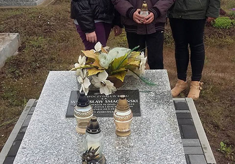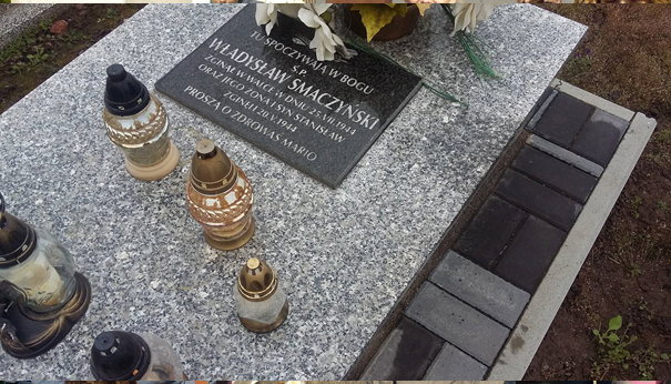 TU SPOCZYWAJĄ W BOGU/ Ś.P./ WŁADYSŁAW SMACZYŃSKI/ ZGINĄŁ W WALCE W DNIU 25.VII.1944/ ORAZ JEGO ŻONA I SYN STANISŁAW/ ZGINĘLI 20.V.1944/ PROSZĄ O ZDROWAŚ MARIO/