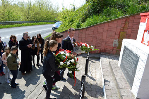 PAMIĘCI POLAKÓW/ POMORDOWANYCH W TYM MIEJSCU 2.II.1944 r./ JAN DUBAL + ROMAN FRANCZAK + JAN GÓRA/ JÓZEF GÓRA + JAN GRUSZKA/ STANISŁAW GRUSZKA + LEON KAŁUŻA/ CZESŁAW KOLERA + ANTONI KOŁBUT/ HENRYK NOWAK + PŁESZKA + PIOTR RYBA/ KAZIMIERZ RZEPKA + WŁADYSŁAW SCHAB/ FILIP SEMPIOŁ + JÓZEF SĘDROWICZ/ JERZY SIERADZKI + STANISŁAW SIMLA/ SKRAJNY + SOCHACKI + ALEKSANDER SZCZESNIAK + JAN WOJTOWICZ + BRONISŁAW ŻYŁA/ MIESZKAŃCY ZAWICHOSTU 1997 R.