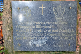 TU ZGINĘLI W WALCE O WOLNOŚĆ POLSKI/ Z OKUPANTEM HITLEROWSKIM/ W DNIU 15 XI 1944 R. DWAJ PARTYZANCI AK/ JUNAK I KOKOSZKA Z KOMPANII JĘDRUSIÓW/ POD DOWÓDZTWEM MAJORA „KAKTUSA”/ CZEŚĆ ICH PAMIĘCI/