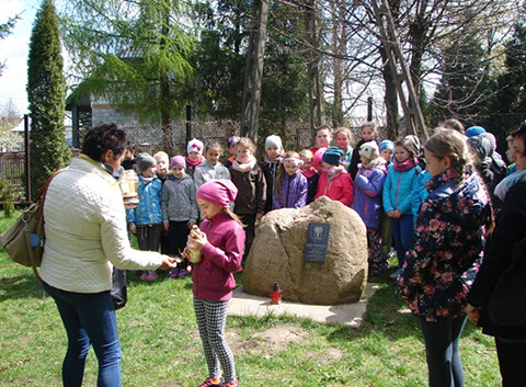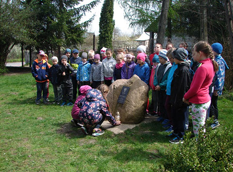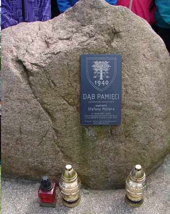DĄB PAMIĘCI/ posadzony dla uhonorowania/ aspiranta/ Stefana Müllera/ ur. 03.08.1908 w Łodzi/ zamordowanego strzałem w tył głowy/ przez NKWD w Twerze w roku 1940/ Program „Katyń… ocalić od zapomnienia”