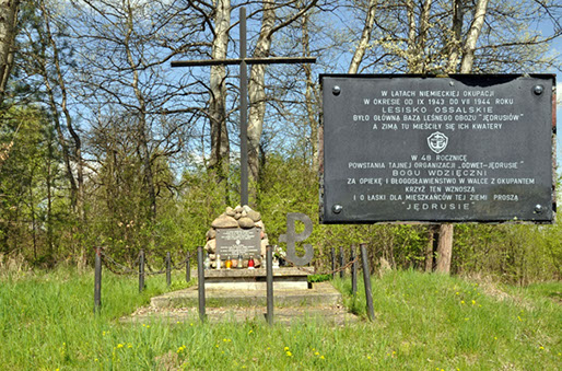 W LATACH NIEMIECKIEJ OKUPACJI/ W OKRESIE OD IX 1943 DO VII 1944 ROKU/ LESISKO OSSALSKIE/ BYŁO GŁÓWNĄ BAZĄ LEŚNEGO OBOZU ”JĘDRUSIÓW”/ A ZIMĄ TU MIEŚCIŁY SIĘ ICH KWATERY/ W 48 ROCZNICĘ/ POWSTANIA TAJNEJ ORGANIZACJI „ODWET–JĘDRUSIE”/ BOGU WDZIĘCZNI/ ZA OPIEKĘ I BOGOSŁAWIEŃSTWO W WALCE Z OKUPANTEM. KRZYŻ TEN WZNOSZĄ/ I O ŁASKĘ DLA MIESZKAŃCÓW TEJ ZIEMI PROSZĘ/ ”JĘDRUSIE”/