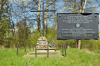 BOGU I OJCZYŹNIE WIERNI/ W DNIU 9 I 1943 R/ W WALCE Z NIEMIECKIM OKUPANTEM/ POLEGLI: D-CA ODDZIAŁU PARTYZANCKIEGO/ „JĘDRUSIE”/ WŁADYSŁAW JASIŃSKI - „JĘDRUŚ”/ ORAZ PARTYZANCI/ ANTONI TOŚ PS. „ANTEK”/ MARIAN GORYCKI PS. „POLIKIER”/