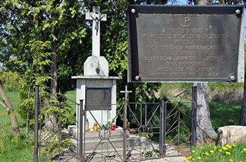 W TYM LESIE W CZERWCU/ I LIPCU 1942 r. HITLEROWCY/ ZAMORDOWALI PONAD 400/ PATRIOTÓW POLSKICH i 900/ RADZIECKICH JEŃCÓW WOJENNYCH/ CZERWONY KRZYŻ, 9.V.1973 r./ SPOŁECZEŃSTWO ZIEMI STASZOWSKIEJ./ W 30-TĄ ROCZNICĘ POWSTANIA LUDOWEGO WOJSKA POLSKIEGO/